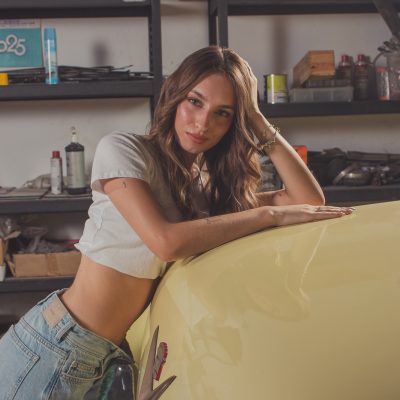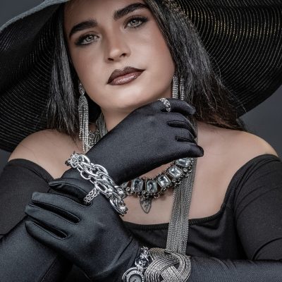 Modelo de desfile de trajes de flamenca con Consolación Ayala y trajes de evento con Alejandro Postigo en septiembre de 2018.
